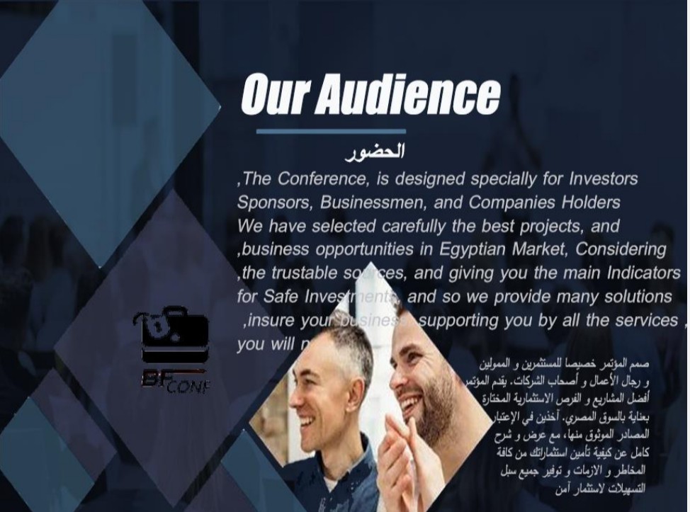 والمؤتمر يقدم صورة متكاملة عن فرص الاستثمار المتاحة والتسهيلات الممنوحة من قبل الدولة لجذب رؤوس الأموال و المستثمرين وبخاصة فى الآونة الاخيرة من أجل جذب المزيد من الاستثمارات والمشاركات الدولية