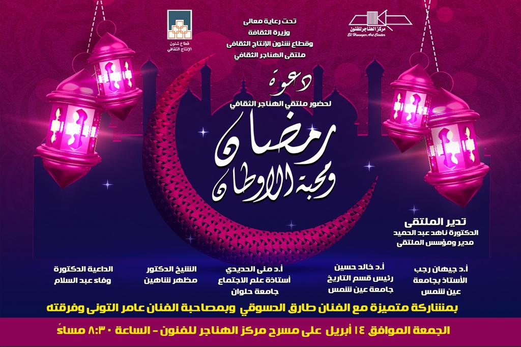يقيم قطاع شئون الإنتاج الثقافى برئاسة المخرج خالد جلال، ملتقى الهناجر الثقافى الشهرى، تحت عنوان “رمضان ومحبة الأوطان”، فى الثامنة و النصف من مساء يوم الجمعة ١٤ أبريل الجارى، بمركز الهناجر للفنون برئاسة الفنان شادى سرور.