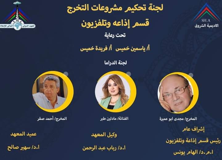 تواصلت دكتورة رباب عبد الرحمن وكيل المعهد الدولي العالي للإعلام بأكاديمية الشروق مع الفنانة والإعلامية مادلين طبر من اجل المشاركة في لجنة الدراما الخاصة بمشروعات تخرج طلبة قسم الإذاعة والتلفزيون بالمعهد.