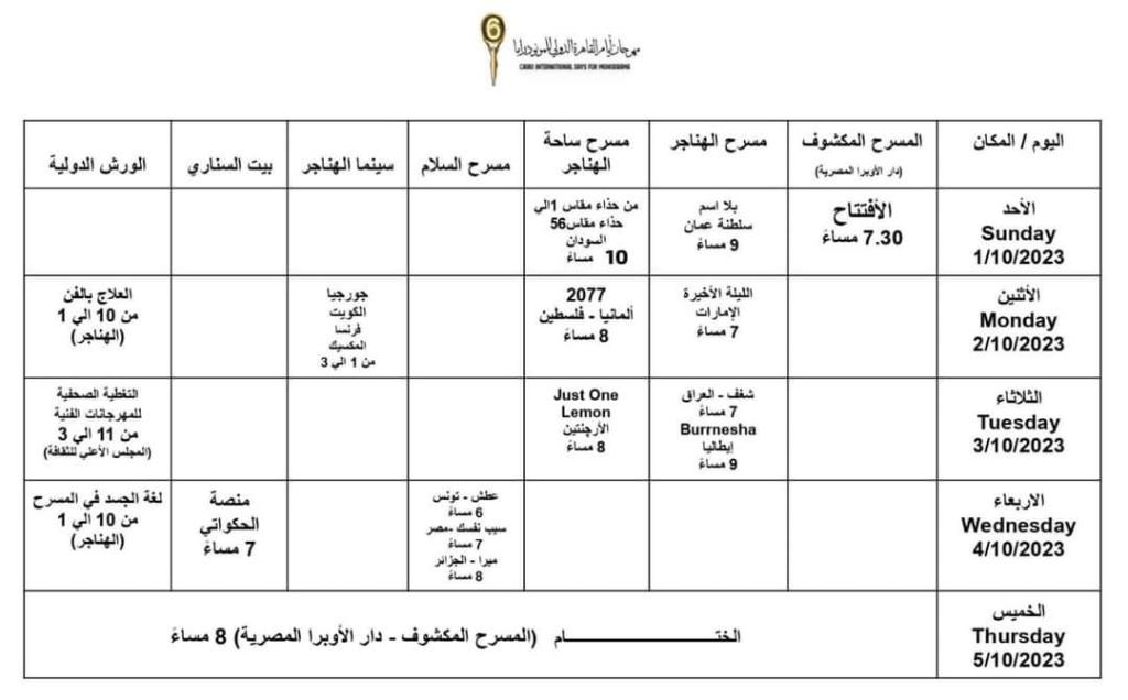 مهرجان القاهرة الدولي للمونودراما تنطلق دورته السادسة في الفترة من 1 وحتى 5 أكتوبر، ويرأسه الدكتور أسامة رؤوف، ويقام المهرجان تحت رعاية وزيرة الثقافة الدكتورة نيڤين الكيلاني .