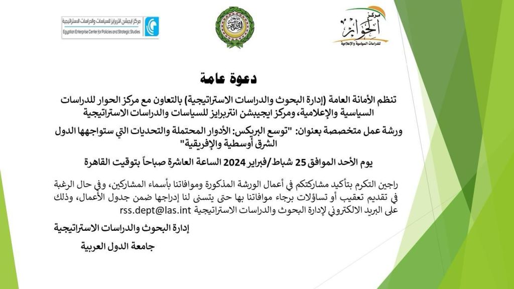 تنظم الإدارة بالتعاون مع مركز الحوار للدراسات السياسية والإعلامية، ومركز ايجيبشن انتربرايز للسياسات والدراسات الاستراتيجية ورشة عمل استشرافية متخصصة بعنوان: “توسع البريكس: الأدوار المحتملة والتحديات التي ستواجهها الدول الشرق أوسطية والإفريقية”.